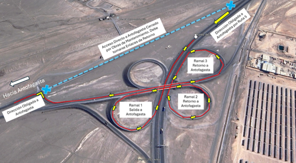Los usuarios que requieran ingresar a Antofagasta durante la jornada deberán utilizar obligatoriamente los retornos de Nudo Uribe. La concesionaria ha detallado un desvío específico que implica pasar la señalética de Chañaral – Antofagasta (que estará cerrada con conos), continuar hacia el pórtico Copiapó – Chañaral, y tomar los retornos y pistas de incorporación subsiguientes hasta reingresar a la Ruta 26 en dirección a la ciudad.