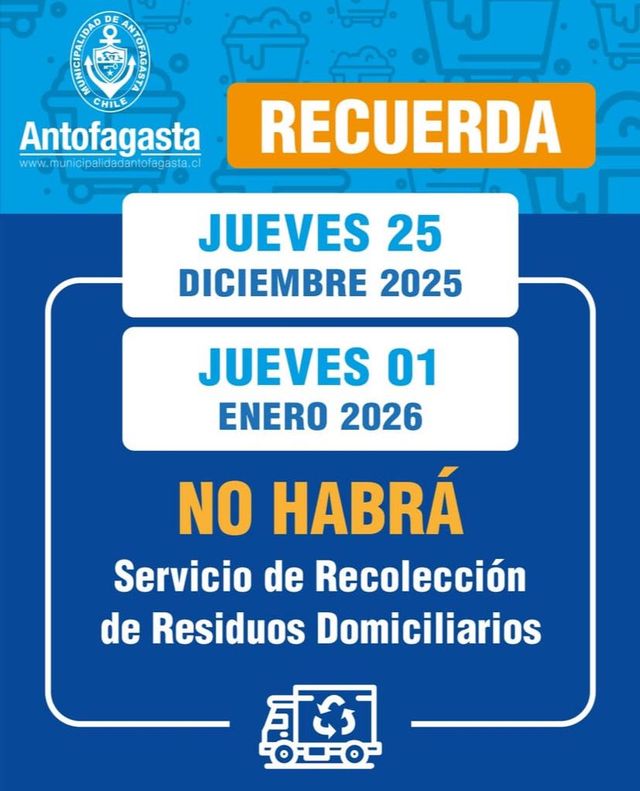 Desde la Municipalidad de Antofagasta confirmaron que el servicio de recolección de residuos domiciliarios se reanudará los próximos 26 de diciembre y 2 de enero.