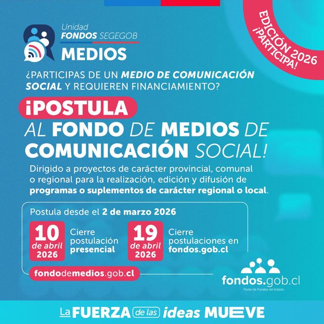 Este 02 de marzo, se abrió el proceso de postulaciones al concurso del Fondo de Medios de Comunicación Social 2026 en Antofagasta, una iniciativa que busca fortalecer el rol de los medios locales y comunitarios en la generación de contenidos de interés público, relevando la identidad y el desarrollo regional.