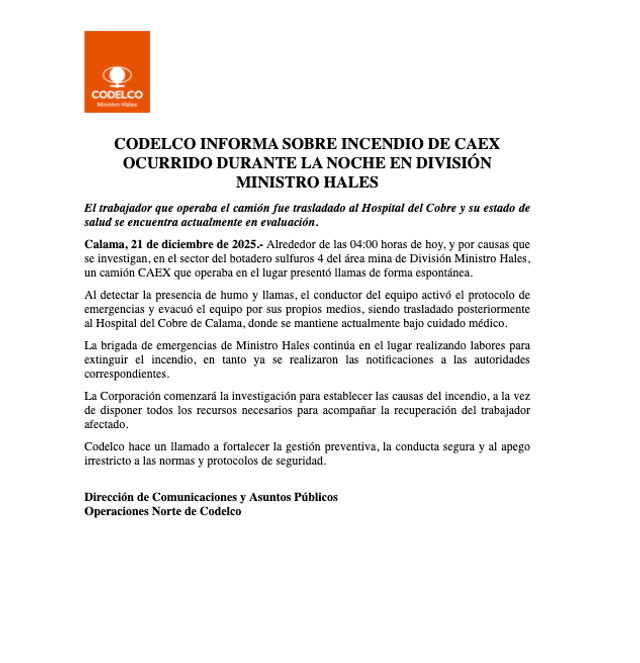 En paralelo, la brigada de emergencias de la División Ministro Hales se mantiene desplegada en el lugar realizando labores de extinción y control del incendio, mientras que el área donde ocurrió el accidente fue paralizada de manera preventiva. Asimismo, Codelco informó que ya se realizaron las notificaciones correspondientes a las autoridades competentes.