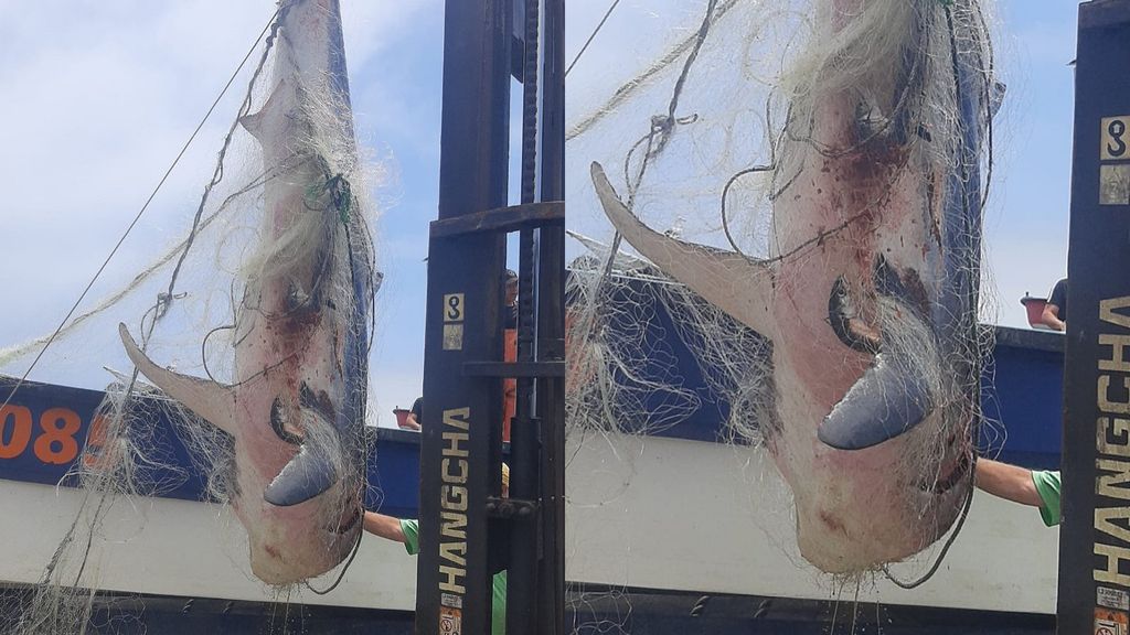 La captura del imponente animal fue resultado de un inusual incidente en el que se enredó con la malla de pescar de uno de los navíos del embarcadero. Ante esta situación, 12 pescadores, con la ayuda de maquinaria, se vieron obligados a realizar una operación para sacar al gigantesco tiburón del mar.